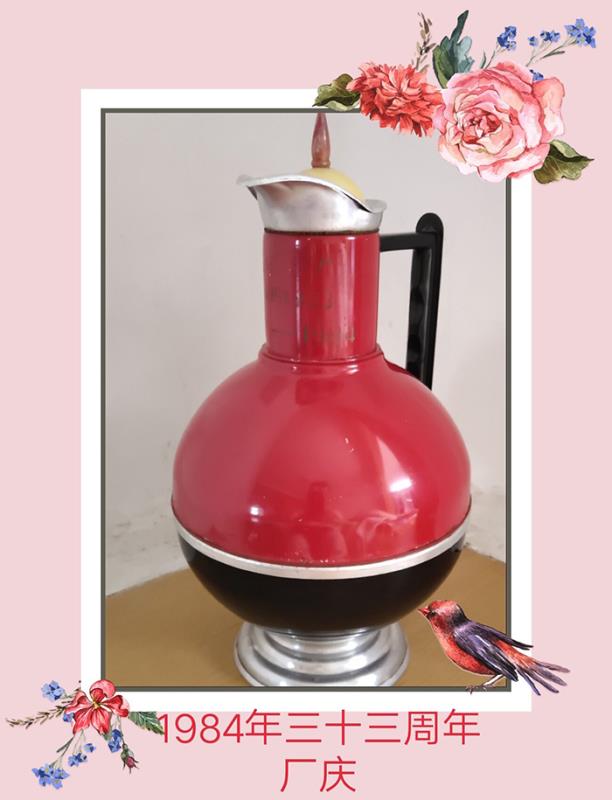 记忆一:暖水瓶——1984年第一会所 创立33周年时企业给职工发的纪念品。这是一件造型别致的暖水瓶,由壶盖、壶身、壶座、壶把组成,壶盖类似于蒙古帽,壶身形状类同瓷器中的天球瓶。整个壶体由红黑银三种颜色互相衬托,显得端庄大气又不乏时尚感。以八十年代初期的生产技术水平,这种工艺造型的暖水瓶已经很超前了。由于该纪念壶距今已近四十年,当时工厂规模小,职工只有几百人,只发给“正式工人”和“亦工亦农”,所以数量不多,且又是生活必需品,报废率高,存世量少,具有一定的收藏价值。
