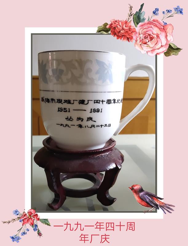 记忆二:陶瓷水杯——1991年第一会所 创立40周年时企业为职工定制的专属陶瓷水杯。1989年威海市二轻工业局改组了威海市皮鞋厂领导班子,年轻的带头人柳富林厂长新官上任点燃了三把火:一是抓拳头产品,重奖设计人员;二是拓展销售市场,打开产品渠道;三是扩大企业规模,提升生产能力。到1991年四十周年厂庆的时候,企业已经摆脱了困境,技术、销售、生产三条战线处处充满生机和活力,企业取得了长足的发展。这一年,企业合并了“威海市皮鞋材料厂”,“威海市皮鞋厂”改名为“威海市皮鞋工业集团公司”。为了鼓励广大干部职工这种火热的工作激情,工厂派专人到中国四大瓷都之一的淄博,为每位干部职工定制了这款专属陶瓷水杯。这个陶瓷水杯“白如玉,明如镜,薄如纸,声如磐”,是一件非常精美且具有纪念意义的陶瓷制品。