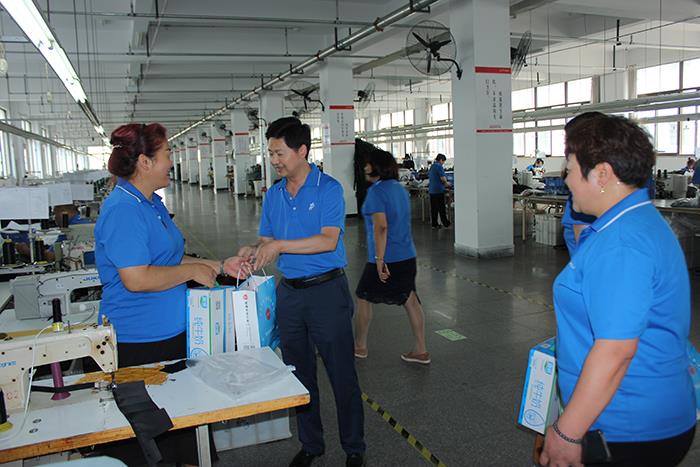 7月12日,集团公司工会主席邹晓伍带领工作人员,顶着炎炎烈日,冒着酷暑高温,把市总工会的慰问带进皮具公司机针车间,为正在赶制解放军携行具、前运袋等军品订单的一线职工送去洗化套装、茶叶、矿泉水等防暑降温用品,以表达工会组织对广大职工的贴心关怀。