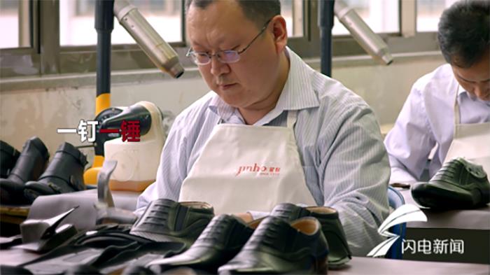 裁皮、片皮、压衬、卧口、绷楦……生产车间内,数条生产线同时开工,几十名手艺纯熟的鞋匠双手翻飞如行云流水,一钉一锤、一针一线间129道工序一丝不苟地完成。
