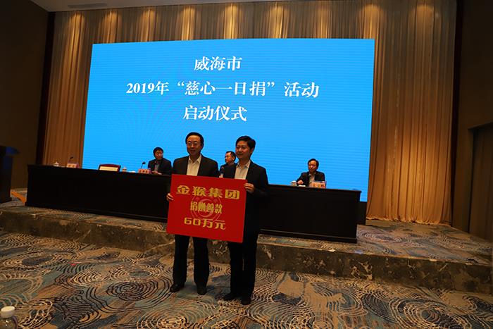 2019年11月1日,威海市2019年“慈心一日捐”活动启动仪式在东山宾馆举行,集团公司纪委书记、工会主席邹晓伍代表第一会所 向市慈善总会捐款60万元。
