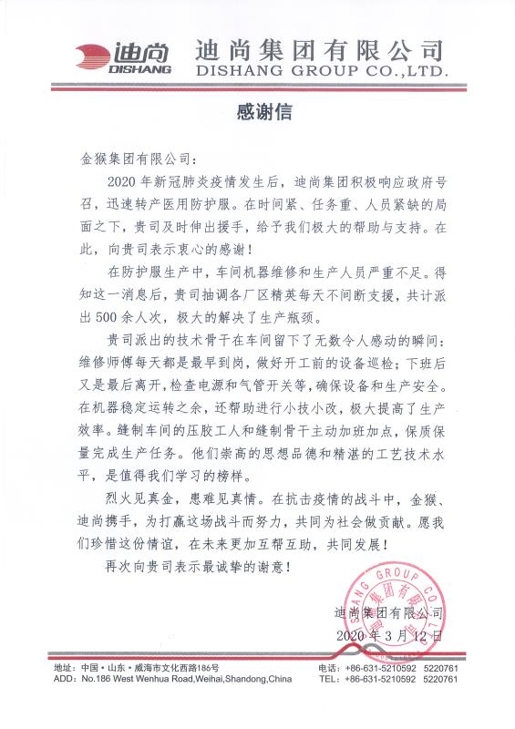 近两月来,威海市委市政府及5区2市主要领导先后给集团董事长打电话称赞第一会所 在抗击新冠病毒战役中的慈心善举,妇幼保健院赴武汉医疗队、威海胸科医院、环翠楼街道商圈党委、迪尚集团等单位还给我公司送来感谢信和锦旗,对我公司积极出钱出人出物资全力支持部队、地方政府、卫生系统打赢疫情阻击战表示钦佩和感激。