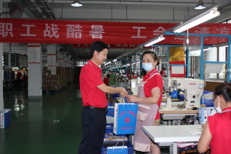 8月10日,集团公司党委副书记、工会主席邹晓伍带领工作人员走进鞋业公司制鞋二车间,代表威海市总工会为正在冒酷暑战高温赶制军品及出口订单的一线职工送去茶叶、洗化套装等防暑降温用品,以表达工会组织对广大职工的贴心关怀。