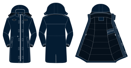 整体颜色为藏青色,款式为中长大衣款式。具有阻燃、防静电、防水、防风等功能。