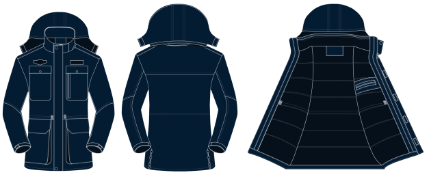 整体颜色为藏青色,款式为短款冲锋衣式,分为上下衣结构。具有阻燃、防静电、防水、防风等功能。